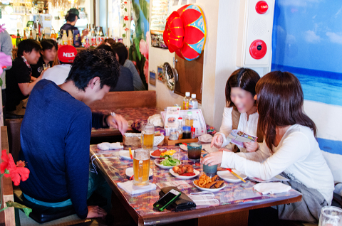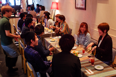 若者コン開始。大きな声で、「カンパ~イ♪」 ※45分ごとに席替えを行い、4組8名の方とお話しできます。 |